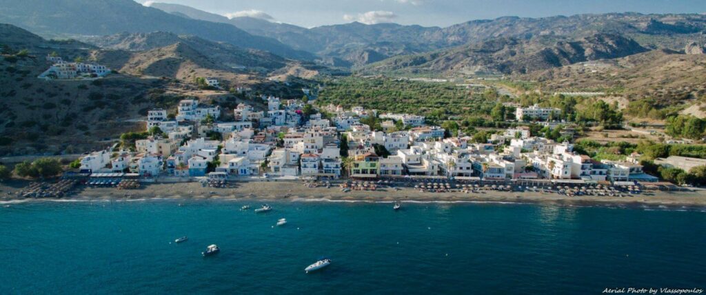 Just a few steps from the entrance, visitors find themselves in the center of the traditional village of Myrtos, where everything is close by: a supermarket, pharmacy, butcher, bakery, cafes, ice cream shop, and ATM. And of course… the beach! A few minutes’ walk away, the calm, sheltered coast of Myrtos invites you to dive in, relax, and take endless walks by the sea. Along the beach, you will find traditional taverns and cafes overlooking the Libyan Sea.